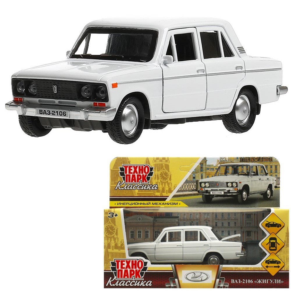 Модель 2106-12-WH ВАЗ-2106 Жигули 12 см, двери, багаж, инерц, белый Технопарк в кор.