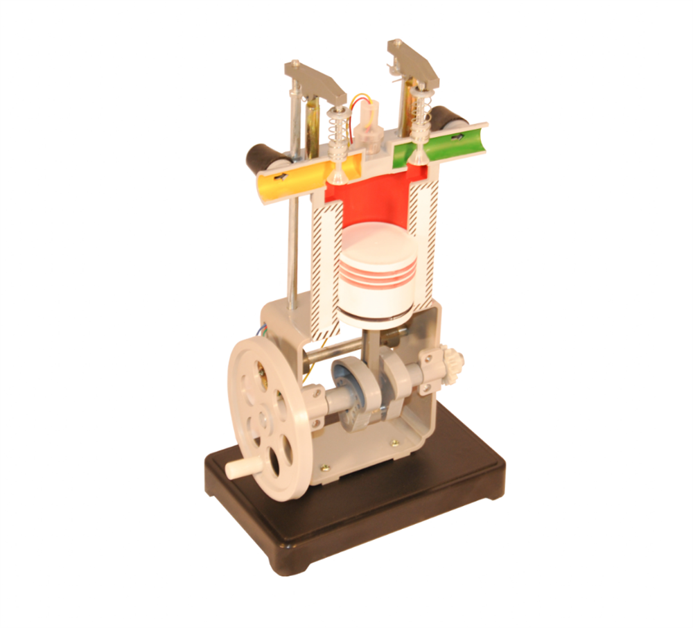 Дизельный двигатель представляет собой демонстрационную объемную модель, изображающую двигатель в разрезе. Отдельные детали модели ярко окрашены, что позволяет выделить ее важнейшие элементы. Взаимодействие элементов модели и демонстрация принципа работы двигателя осуществляется при помощи вращения рукоятки, которая приводит в действие шатунно-кривошипный механизм поршня и кулачковый механизм управления клапанами. Перед началом демонстрации необходимо: