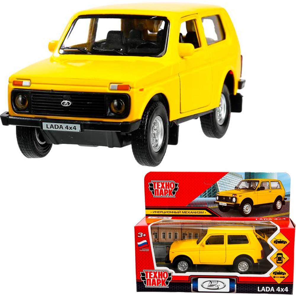 Модель LADA4X4-12-YE LADA 4х4 12 см, двери, багаж, инерц, желтый Технопарк в кор.
