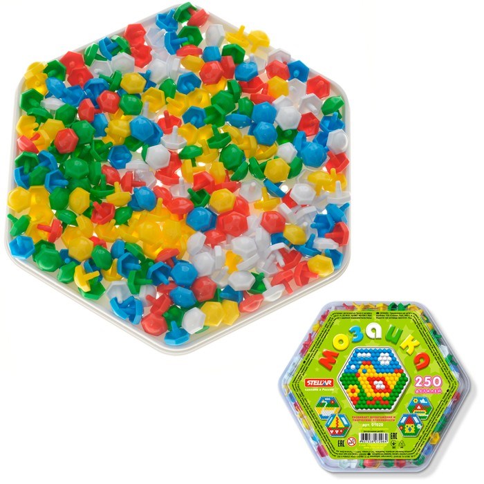 Знакомая с детства шестигранная мозаика на шестигранном поле - в ярком исполнении. Игрушка изготовлена из качественного, нетоксичного пластика. Целых 250 фишек, диаметром 1,3 см, дают большой простор для детского творчества и фантазии, развивают мелкую моторику, пространственное воображение и цветовое восприятие. На этикетке изображены несколько примеров сборки, которым ребенок может следовать при знакомстве с игрой, а затем придумывать собственные варианты картинок. Мозаика находится в удобном пластиковом футляре, благодаря которому мелкие детали не растеряются.