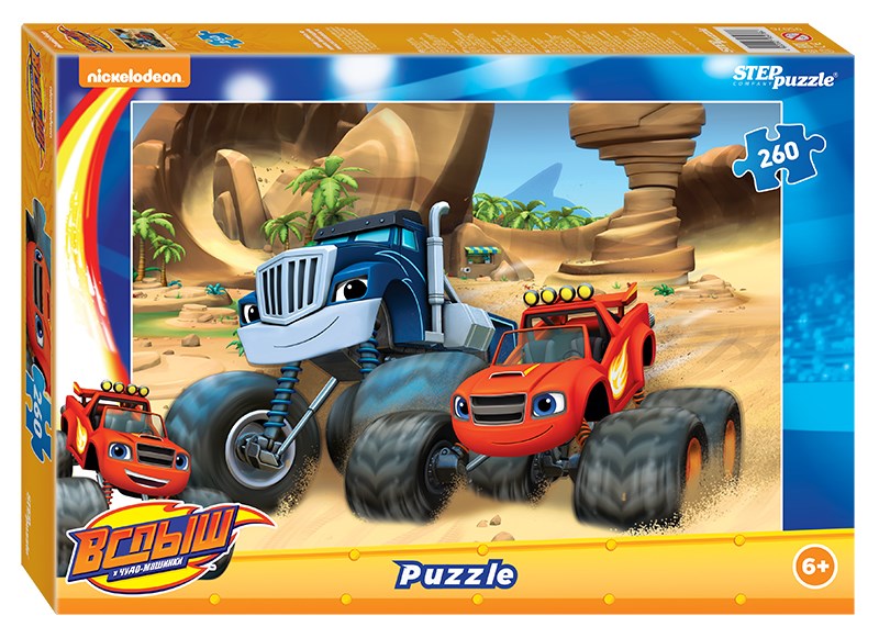 Пазл «Вспыш и чудо-машинки» состоит из 260 деталей. На картинке изображены две машинки — сам Вспыш и его главный соперник Крушила. Кто же станет победителем в этой гонке по пустыне?