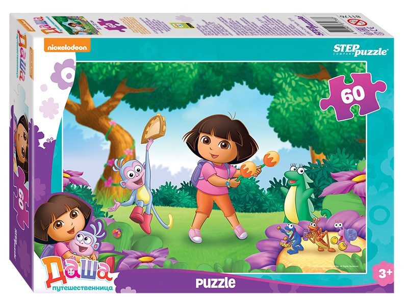 Пазл «Даша-путешественница» состоит из 60 деталей. На картинке Даша и обезьянка по имени Башмачок радуются, танцуют и играют на музыкальных инструментах.