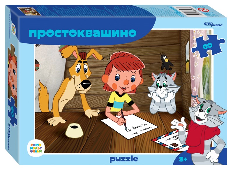 Пазл «Простоквашино» состоит из 60 деталей. Здесь на картинке мы видим, как Дядя Федор вместе с Матроскиным и Шариком пишет письмо родителям.