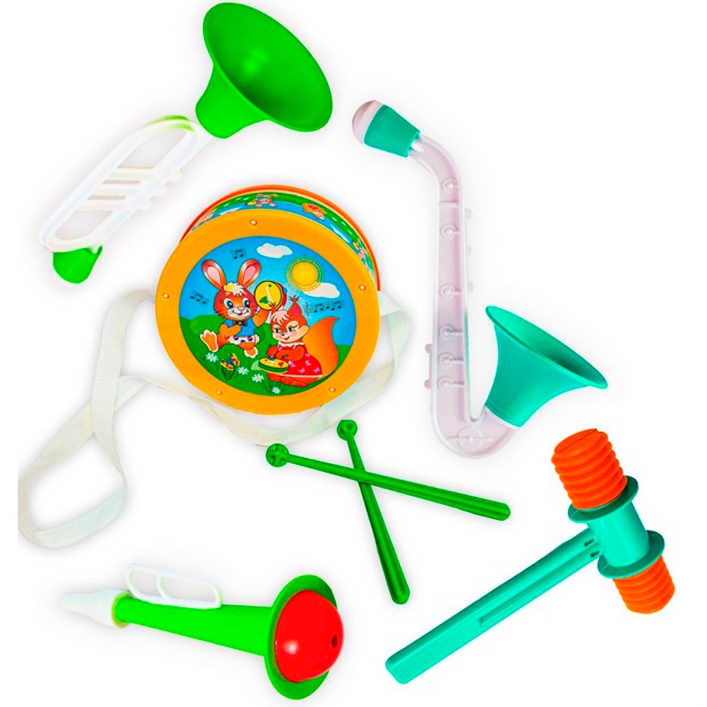 Комплектация: труба - 2 шт, саксофон - 1 шт, молоток - 1 шт, барабан - 1 шт, барабанные палочки - 2 шт