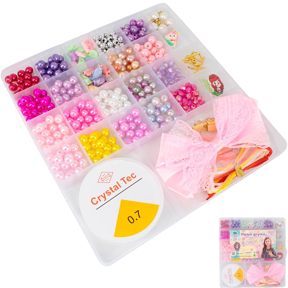Комплектация: бусины (20 видов), подвески-украшения (4 видов), силиконовая нить-резинка (0.7), разноцветные нити, бантик, мини ножницы