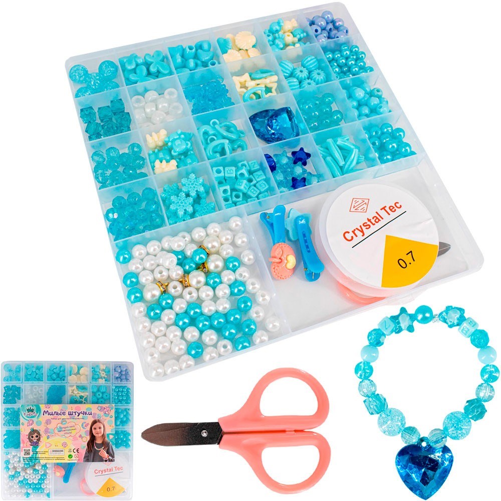 Комплектация: бусины разных форм и цветов (25 видов), мини-ножницы – 1 шт., моток лески (0,7 м) ¬– 1 шт., заколки – 2 шт. удобный пластиковый бокс для хранения – 1 шт.