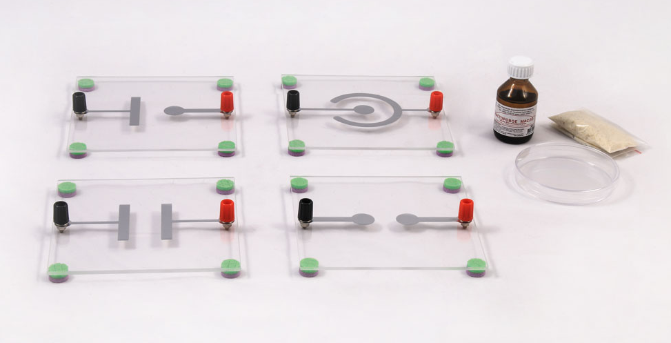 Набор для демонстрации электрических полей предназначен для демонстрации картин распределения силовых линий электростатического поля, возникающего вокруг заряженных тел различной конфигурации.