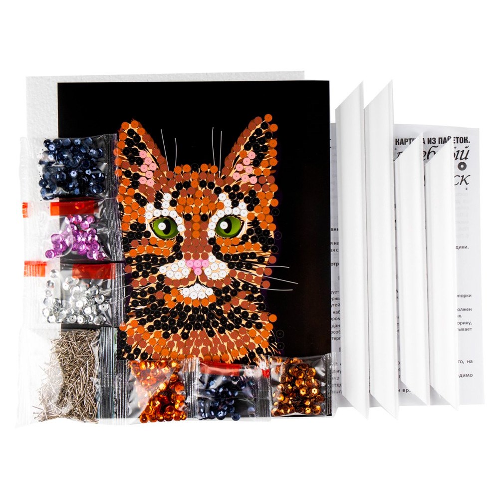 Комплектация: разноцветные пайетки, основа, рамка, цветная схема, пин-гвоздики, инструкция