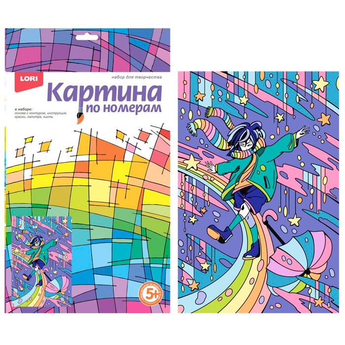 В набор входит картина для раскрашивания, на которую нанесена нумерованная схема рисунка, набор акриловых красок и кисть.