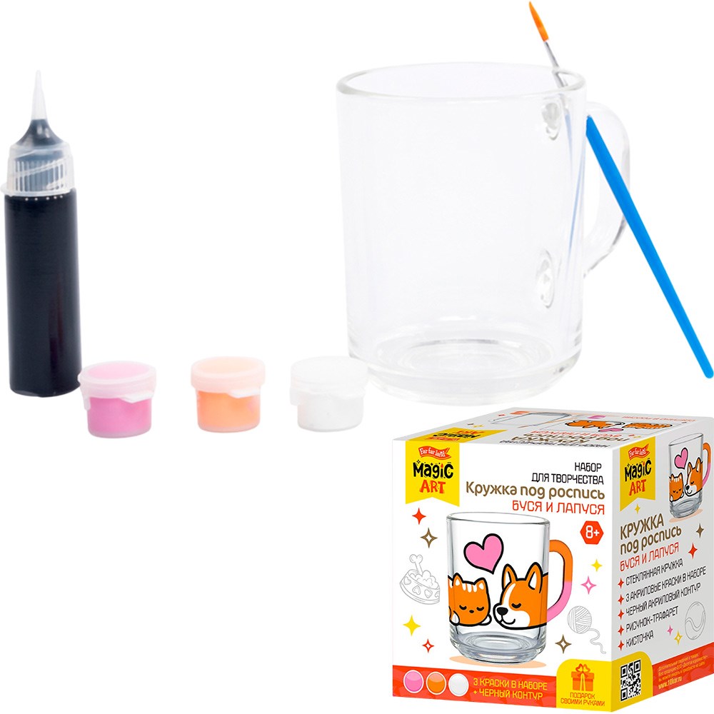 Комплектация: кружка - 1 шт., акриловые краски – 3 шт., кисть – 1 шт., шаблон - 1 шт.