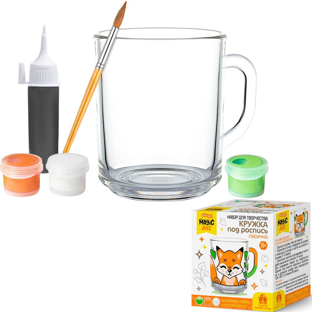 Комплектация: кружка, кисть, набор акриловых красок - 3 цв., рисунок-трафарет, контур черного цвета
