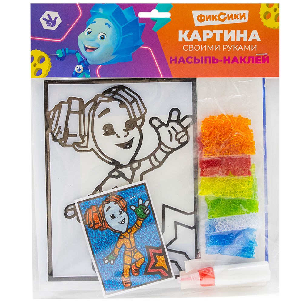 В набор входит картинка с контуром рисунка и углублениями, в которые нужно налить клей и распределить цветные бусины, чтобы раскрасить изображение.