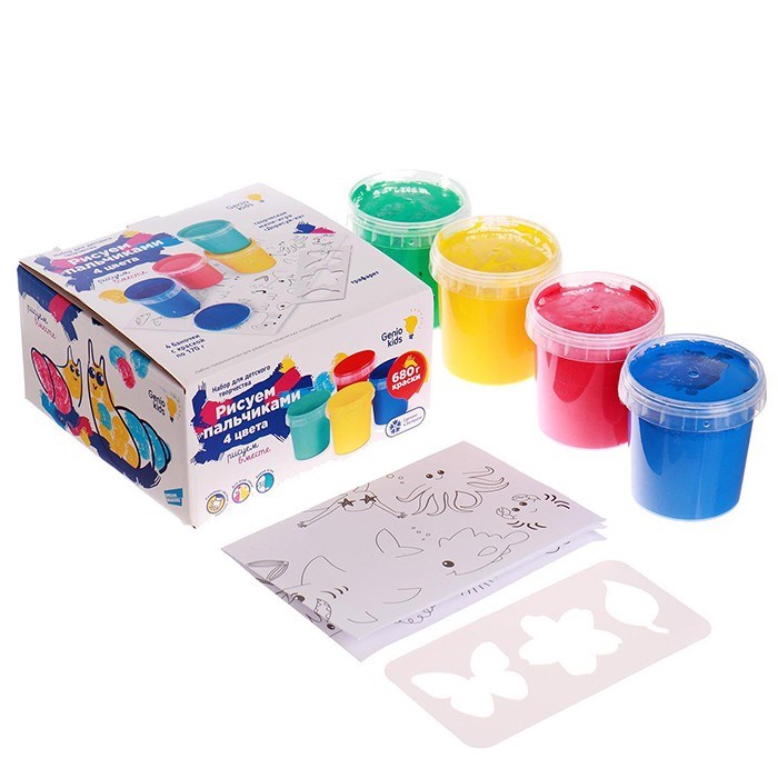 Комплектация: пальчиковые краски - 4 цв., трафареты, лист с картинками