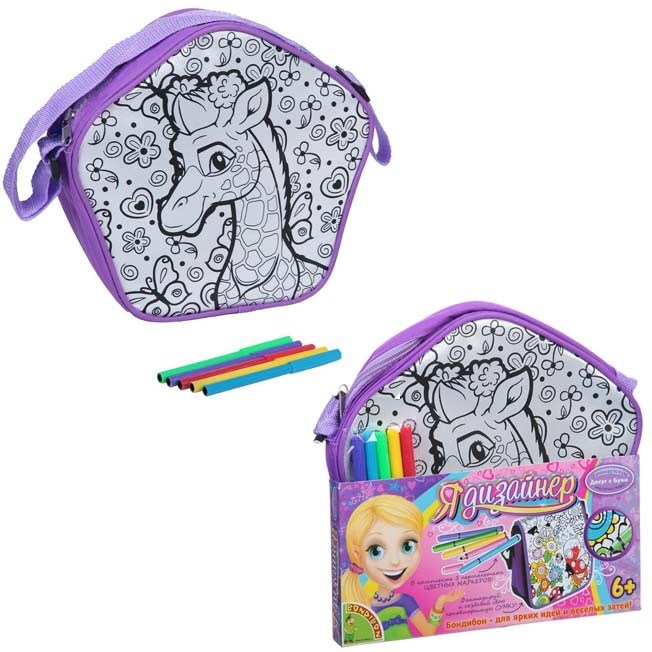 Набор для раскрашивания сумочки порадует и удивит маленькую модницу. В набор входят перманентные фломастеры, которыми ребенку предстоит раскрасить веселую мордашку жирафа, бабочек и цветочки. Все изображения нанесены в виде контура. Форма сумочки довольно необычная - она пятиугольная, а боковые части и ручка - сиреневого цвета.