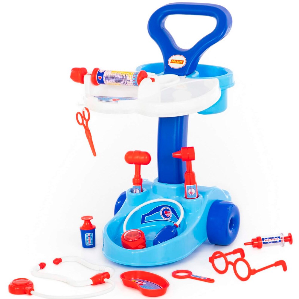 Набор доктора на тележке достаточно мобилен и малыш сможет быстро оказать помощь своим пациентам. В этом ему помогут, входящие в набор, ножницы, очки, лупа, шприц, лоточек для шприца, стетоскоп, тонометр, фонендоскоп, молоточек, баночка с крышкой. Возможно, именно с этого набора у будущего врача начнется любовь к медицине.