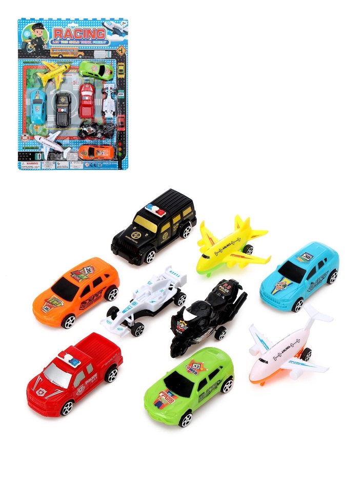- В наборе представлены разноцветные машинки с гоночным дизайном.