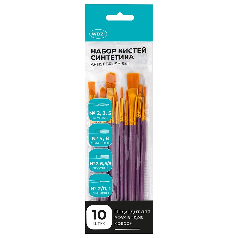 Набор кистей 10 шт. синтетика ,фиолетовые, № 2/0-8, (Круглые; Овальные; Плоские; Лайнеры) 201086