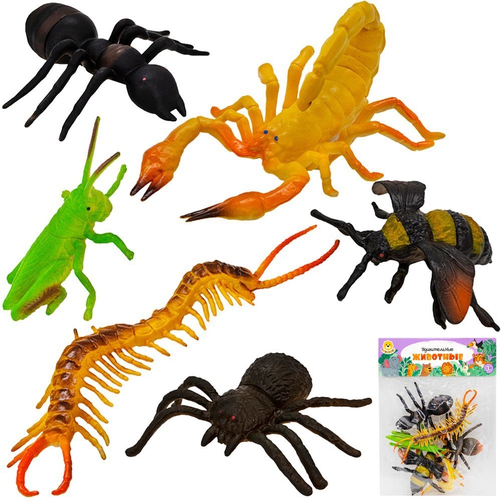 Комплектация: многоножка (19 х 4 см) - 1 шт., кузнечик (13 х 7 см) - 1 шт., паук (11 х 10 см) - 1 шт., шмель (12 х 10 см) - 1 шт., скорпион (12 х 7 см) - 1 шт., муравей (11,5 х 12 см) - 1 шт.