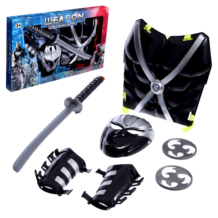 - В комплект входят 7 предметов: маска, катана, два сюрикена, два защитных наруча и панцирь, выполненные в стильном чёрном и серебристом дизайне.