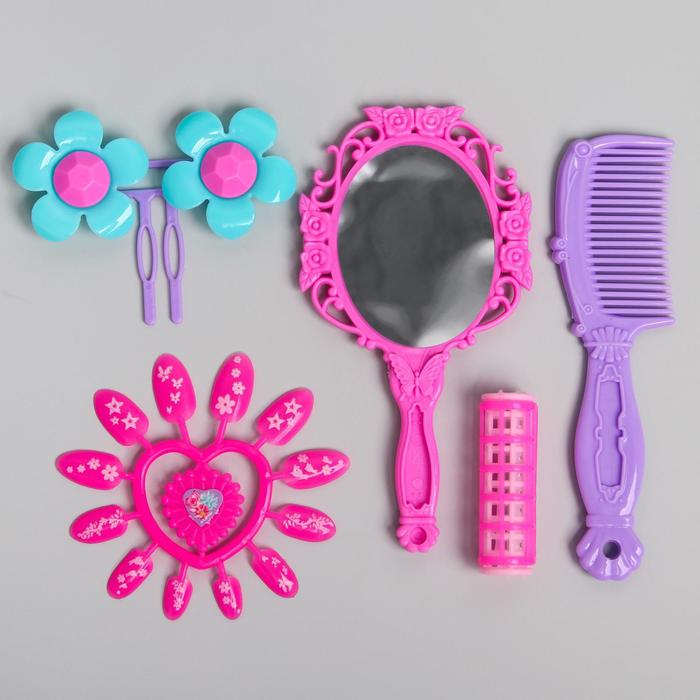 - В комплекте 6 предметов: расчёска, зеркало, накладные ногти, заколка и бигуди. Каждый элемент повторяет настоящие инструменты стилиста, но адаптирован под детскую игру: безопасные, удобные, яркие.