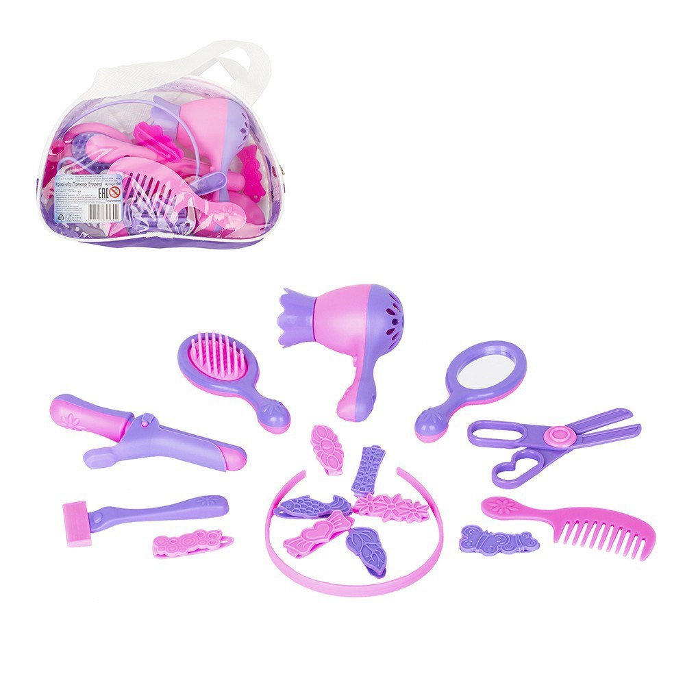 набор "Парикмахер" в удобной сумке подойдет для игры в салон красоты и парикмахерскую. В комплект входят 16 предметов, выполненных в нежной цветовой гамме: фен, зеркало, расческа, плойка, массажная расческа, бритвенный станок, ножницы, 8 заколок для волос, ободок для волос. Все элементы реалистичны, хорошо детализированы, а игра с ними поможет девочке в процессе становления чувства вкуса и развитии мелкой моторики. Набор изготовлен из качественных нетоксичных материалов.