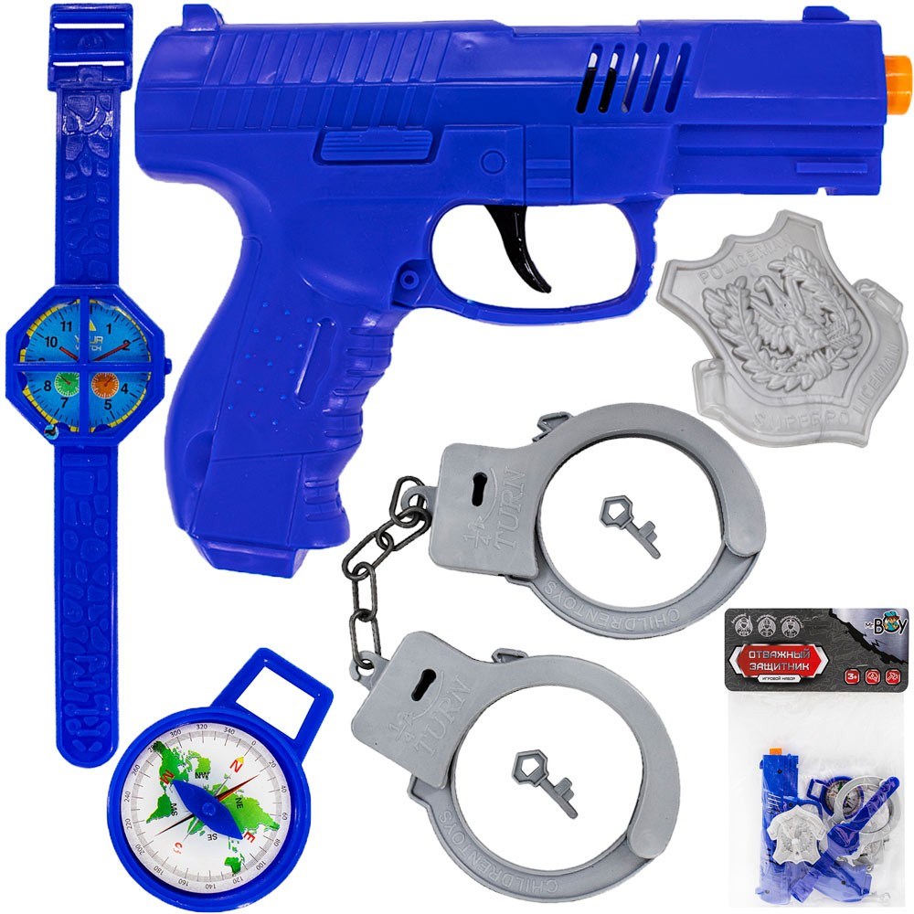 Комплектация: пистолет – 1 шт., значок полицейского – 1 шт., наручники – 1 шт., ключи от наручников – 2 шт., компас – 1 шт., наручные часы – 1 шт.