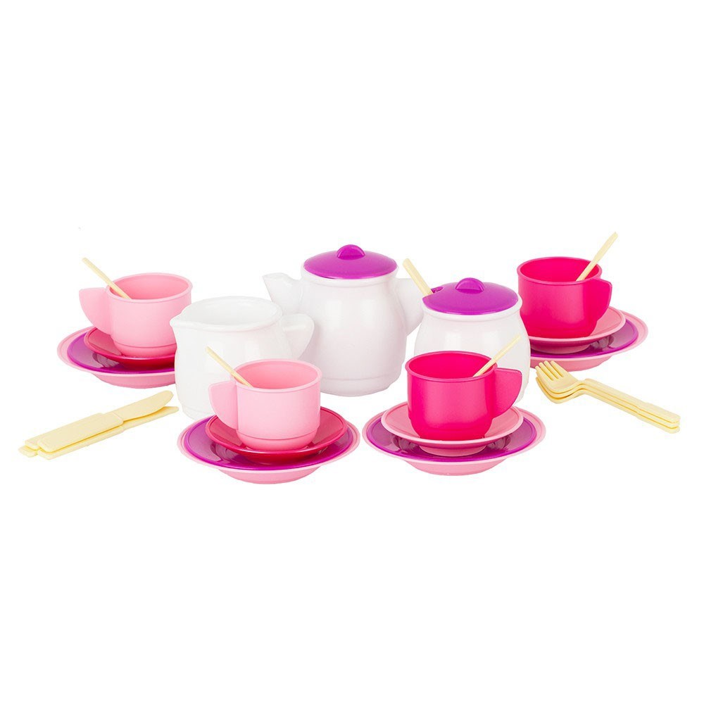 Набор игрушечной посуды из 33 предметов поможет провести веселое чаепитие в кругу друзей или с любимыми игрушками. В комплект входят чайник, сливочник, сахарница, чашки, блюдца, ложки, вилки и ножи - играя с такими приборами ребенок не только отлично проведет время, но и познакомится с их назначением и правилами поведения за столом. Набор изготовлен из высококачественной пластмассы, не имеет острых частей и зазубрин. Цвета представлены в ассортименте.