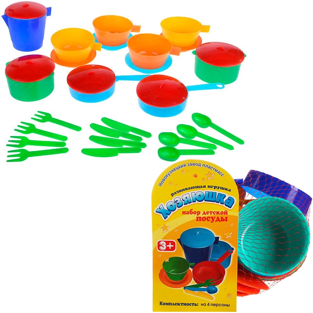 Набор детской посуды "Хозяюшка" на 4 персоны позволит девочке почувствовать себя маленькой хозяйкой: готовить для кукол и угощать гостей. Набор развивает моторику рук, фантазию, мышление, коммуникативные навыки. Ребёнок учится использовать столовые приборы и другие кухонные атрибуты. Играть набором детской посуды можно дома, а также на свежем воздухе. Все элементы выполнены из качественного и безопасного пластика. Набор упакован в сеточку.