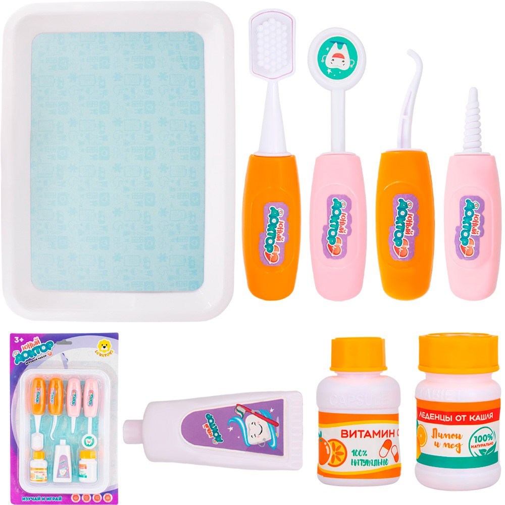 Комплектация: поднос (17,5 х 24,5 см) – 1 шт., зубная паста (3,5 х 8,5 см) – 1 шт., зубная щетка (14 х 3 см) – 1 шт., стоматологическое зеркало (13,5 х 3,5 см) – 1 шт., зонд стоматологический (12 х 3 см) – 1 шт., сверло (11 х 3 см) – 1 шт., баночка с надписью "витамины" (3,5 х 6 см) – 1 шт., баночка с надписью "леденцы от кашля" (3,5 х 6 см) – 1 шт.