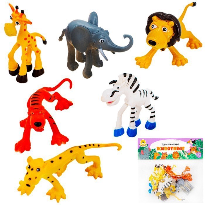 Комплектация: жираф (5,5 х 9 см) - 1 шт., слон (9 х 6,5 см) - 1 шт., лев (9 х 7 см) - 1 шт., тигр (11 х 4 см) - 1 шт., зебра (9,5 х 8 см) - 1 шт., гепард (11 х 4 см) - 1 шт.