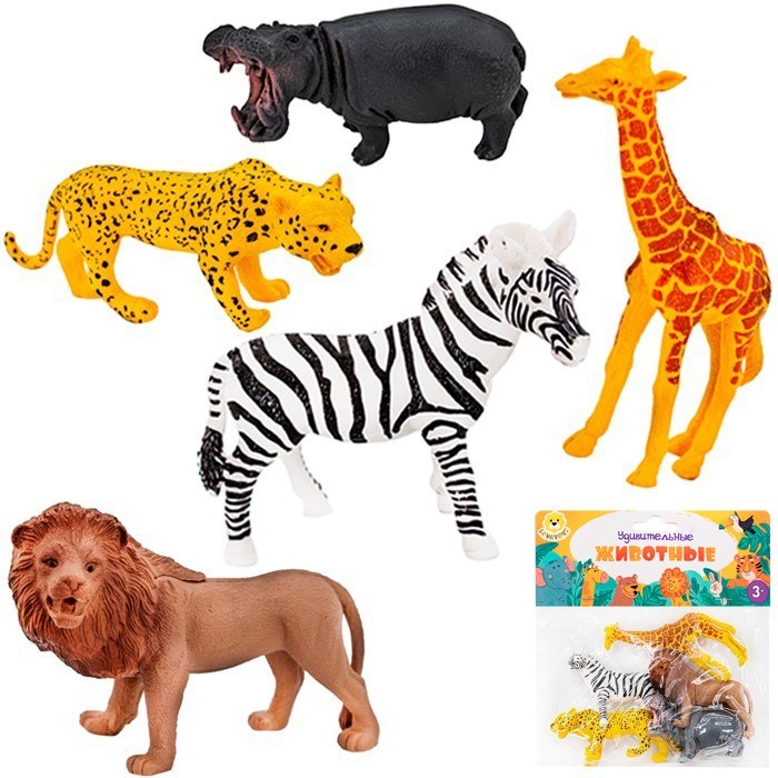 Комплектация: леопард (15 х 6 х 3 см) - 1 шт., бегемот (11 х 7 х 3,5 см) - 1 шт., зебра (12 х 9,5 х 4 см) - 1 шт., жираф (12 х 13 х 3,5 см) - 1 шт., лев (11,5 х 9 х 5 см) - 1 шт.