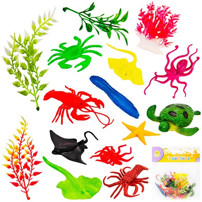 Комплектация: осьминог (13 х 9 см) – 1 шт., краб (3,5 х 4,5 см) – 1 шт., креветка (16,5 х 9 см) – 1 шт., скат (5,5 х 6,5 см; 6,5 х 8,5 см; 5 х 8 см) – 3 шт., морская звезда (3 х 3 см) – 1 шт., электрическая рыба (7,5 х 1 см) – 1 шт., черепаха (9 х 8 см) – 1 шт., лобстер (4 х 6 см) – 1 шт., морские растения (от 5 до 10 см) – 4 см.