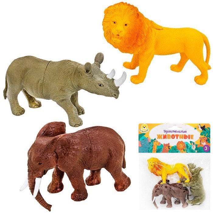Комплектация: лев (14 х 9 х 4,5 см) - 1 шт., слон (12 х 8 х 4,5 см) - 1 шт., носорог (14,5 х 7 х 4 см) - 1 шт.