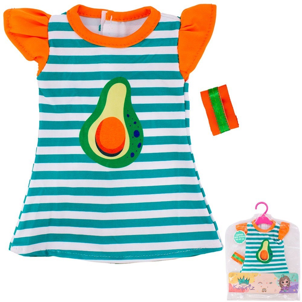 Платье для пупса Miss Kapriz станет прекрасным подарком для маленькой принцессы и её любимых кукол! Платье в яркую полоску с модным принтом авокадо.