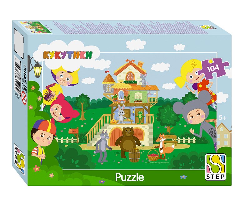 Пазл «Кукутики» на 104 элемента предлагает более сложный вызов и стимулирует логическое мышление и терпение у ребёнка.
