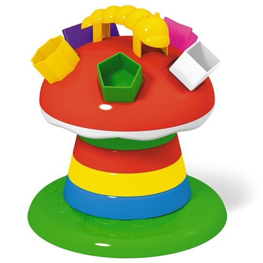 Логическая пирамидка «Гриб на полянке» - это две игрушки в одной. Основание, это обычная пирамидка, а шапочка гриба выполнена в виде сортера. Для удобства малышей, которые любят таскать за собой игрушки по комнате, на шапочке гриба поселилась гусеничка-ручка.