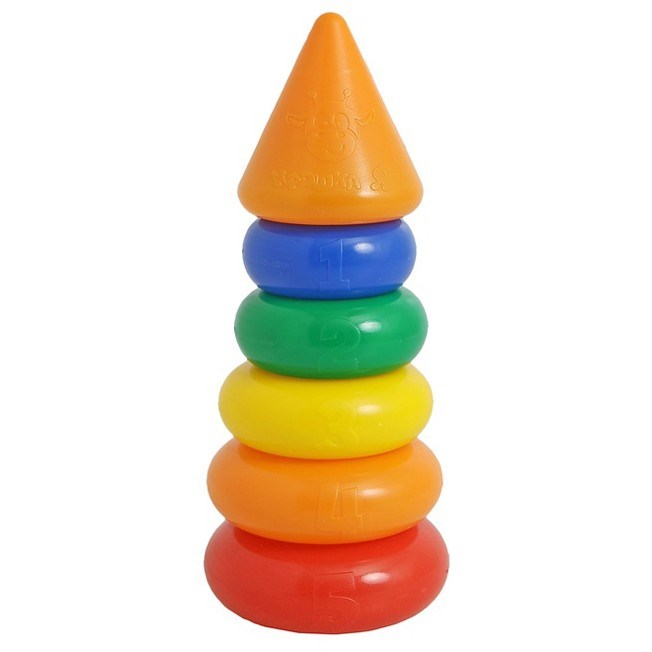 Пирамидка 5 колец, с конусом — одна из первых развивающих игрушек малыша, которая состоит из основы-стержня, круглых колец и наконечника в виде конуса с весёлой мордочкой жирафа.