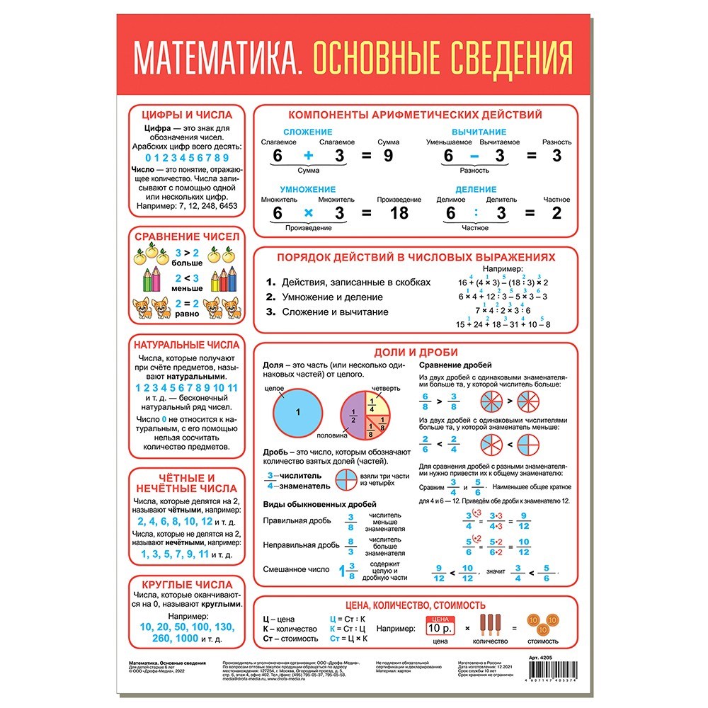 Ребёнок запомнит знаки сравнения и компоненты арифметических действий, выучит порядок выполнения действий и формулы нахождения цены, количества, стоимости.
