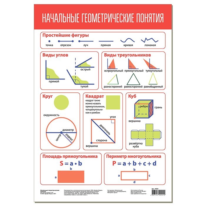 Плакат «Начальные геометрические понятия» можно использовать на уроках математики или арифметики в начальных классах.