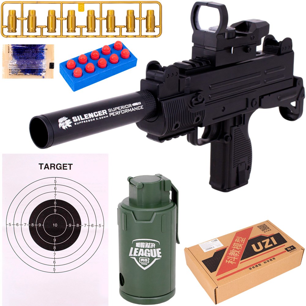Комплектация: автомат - 1 шт., пульки - 1 уп., глушитель - 1 шт., граната - 1 шт., гильзы