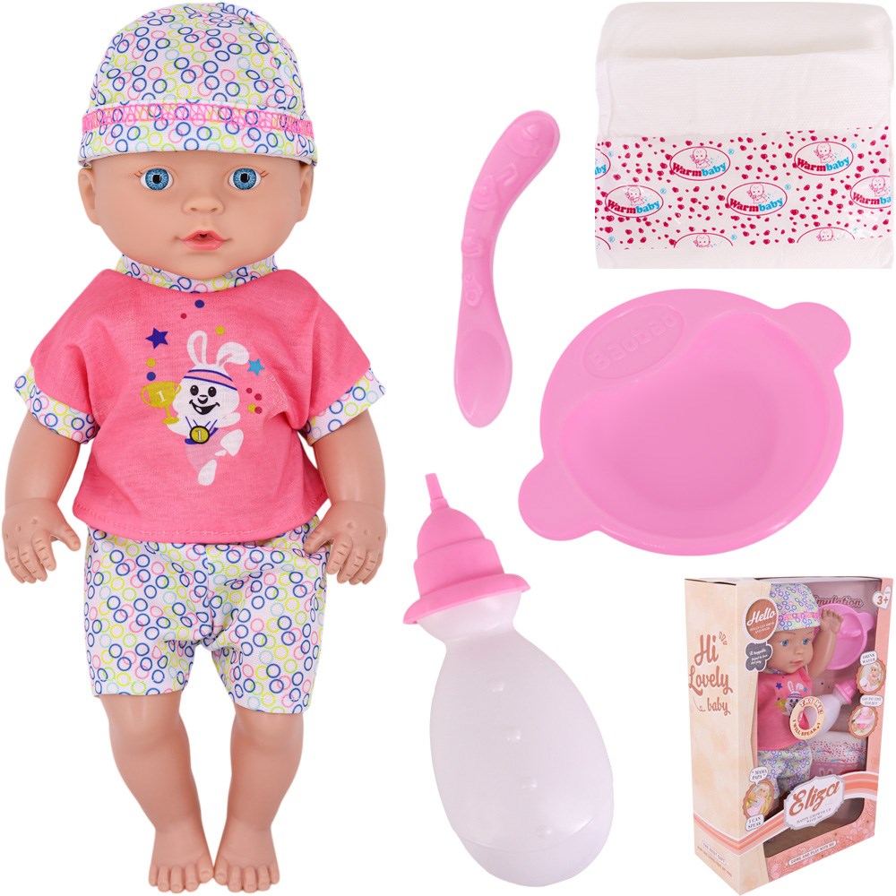 Комплектация: пупс - 1 шт, аксессуары: тарелка - 1 шт, бутылочка - 1 шт, памперс - 1 шт.