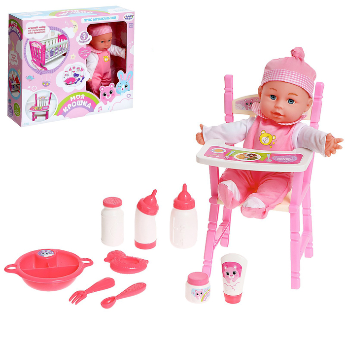Пупс как настоящий малыш: у него есть собственный стульчик для кормления, множество бутылочек, баночка со смесью, лосьон для тела и детская посуда. Малышка будет по-настоящему счастлива, ведь теперь её игры будут реалистичнее и разнообразнее.