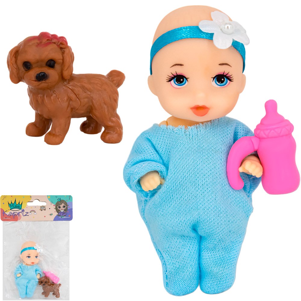 Комплектация: пупс (9 х 4 см) – 1 шт., щенок (4 х 3,5 см) – 1 шт., погремушка (1,5 х 1,5 см) – 1 шт.