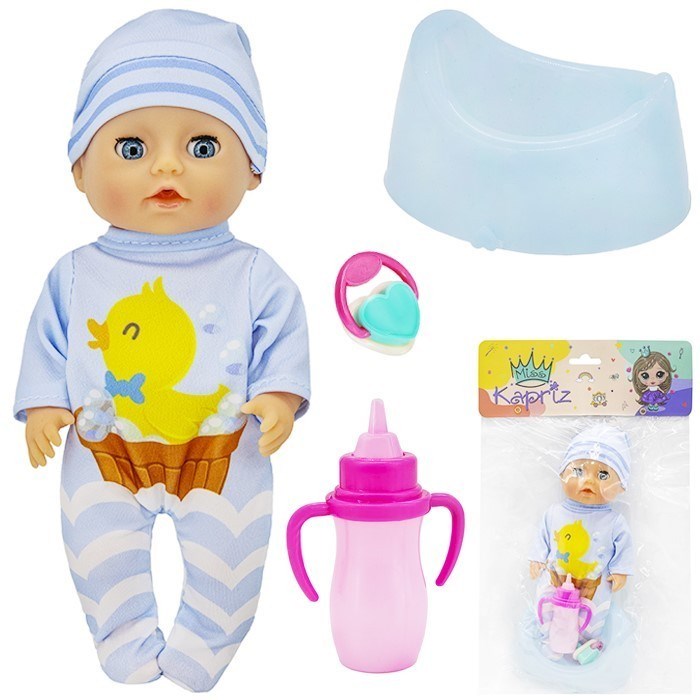 Комплектация: пупс, соска, бутылочка для кормления, горшок
