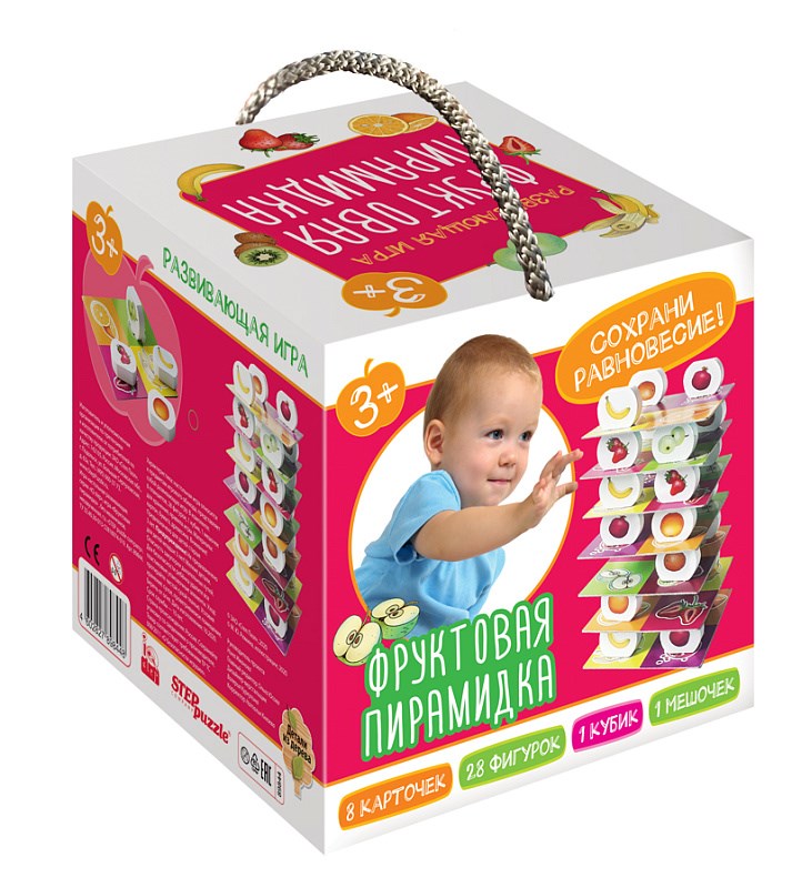 «Фруктовая пирамидка» — это одновременно и балансир, и игра, похожая на лото. Участникам в процессе нужно построить пирамидку из карточек и деревянных фигурок. Игроки ходят по очереди, но нужную фигурку определяют через бросание кубика.
