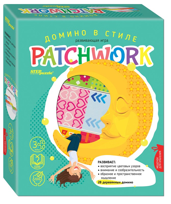 «Домино в стиле patchwork» похожа на классическое домино. Игра развивает внимание, сообразительность, восприятие цветов и пространственное мышление. Фишки тут сделаны из дерева — их удобно брать и приятно держать в руках!