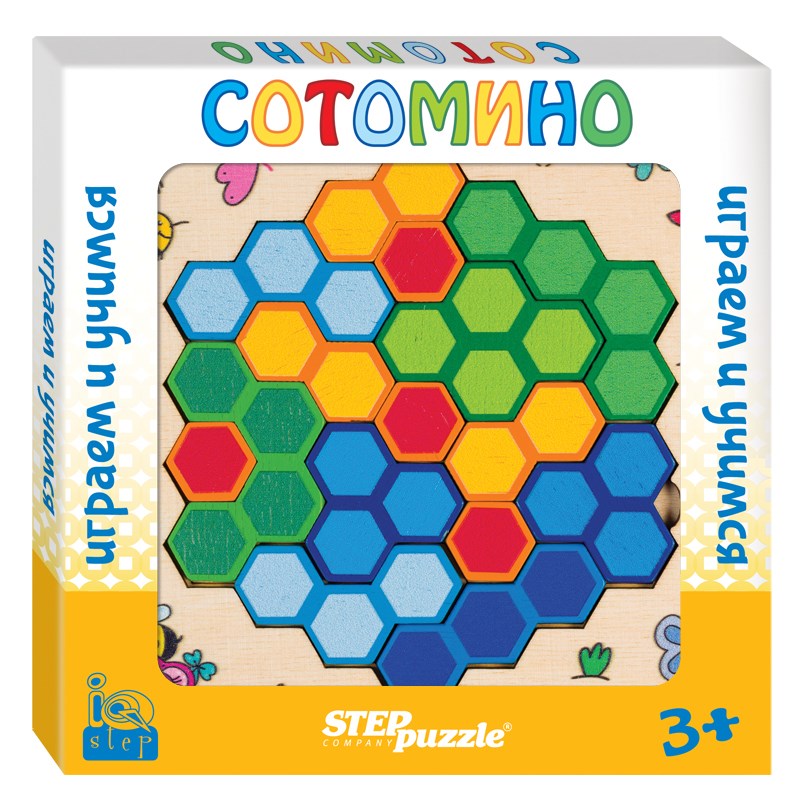Игра из дерева «Сотомино» — увлекательная головоломка. Она состоит из 15 плоских деревянных деталей, внешне напоминающих соты. В набор также входят восемь карточек с заданиями.