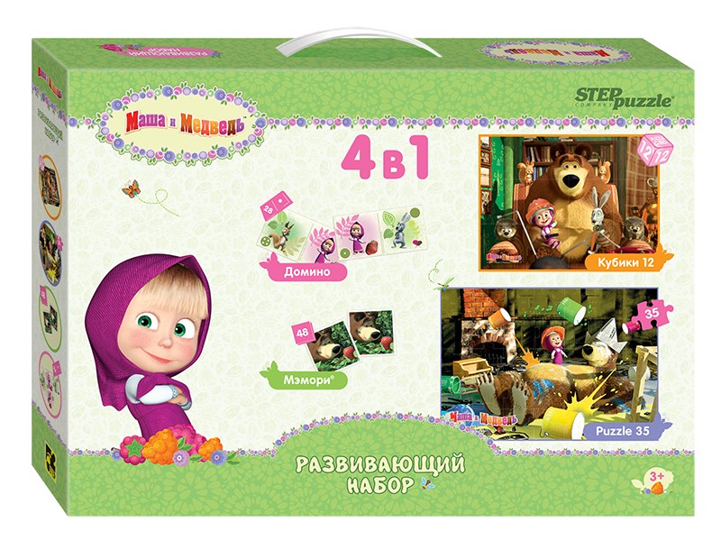 Развивающий набор 4в1 "Маша и Медведь" содержит 4 игры: кубики, пазл на 35 элементов, настольные игры мэмори и домино.