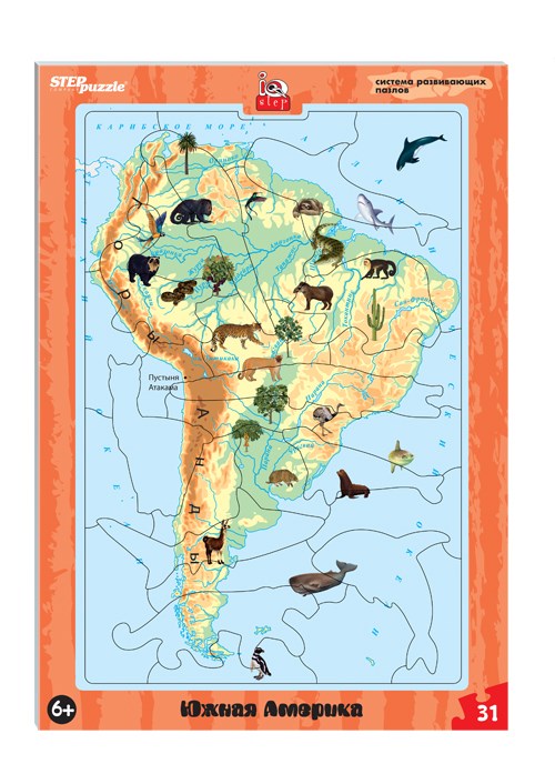 Развивающий пазл «Южная Америка» ориентирован на активное развитие речи, памяти, внимания, логического и образного мышления. Пазл интересен тем, что некоторые его детали необычной формы. Они сделаны в виде фигур - например, ребёнок сможет разглядеть тут кита, ламу и других. Всего пазл состоит из 31 детали. На обороте планшета написаны интеерсные факты о Южной Америке, её животных, растениях и интересных объектах.