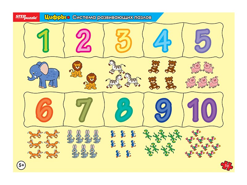 Выньте пазлы-вкладыши. Задача ребенка - подобрать к цифре определенное количество нарисованных животных.